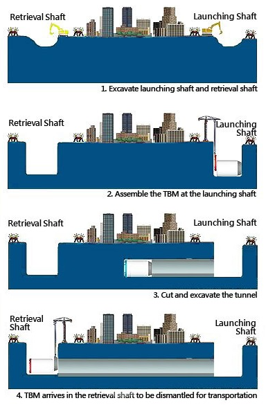 TBM 공법은 커터헤드(Cutterhead)를 회전시켜 지반을 굴착한 뒤, 내부에서 자동화된 방식으로 버력 반출, 세그먼트 조립, 막장압 유지 등을 수행한다. 주로 쉴드 TBM 방식이 사용되며, 지반 상태에 따라 이수식(Slurry Pressure Balanced, SPB)과 토압식(Earth Pressure Balanced, EPB)으로 나뉜다.