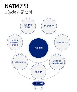 NATM 공법은 주변 암반을 굴착한 후 숏크리트, 락볼트, 강지보(스틸 세그먼트) 등의 보조지보재로 초기 지반을 안정화시키고, 지반 변형을 허용하면서도 구조적 안전을 확보하는 방식이다.